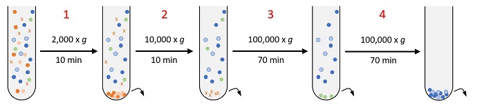 • (1) Differential ultracentrifugation (DUC) makes use of multiple spins of progressively increasing speeds to first remove contaminants and then pellet exosomes. This step is often followed by further centrifugal purification steps.